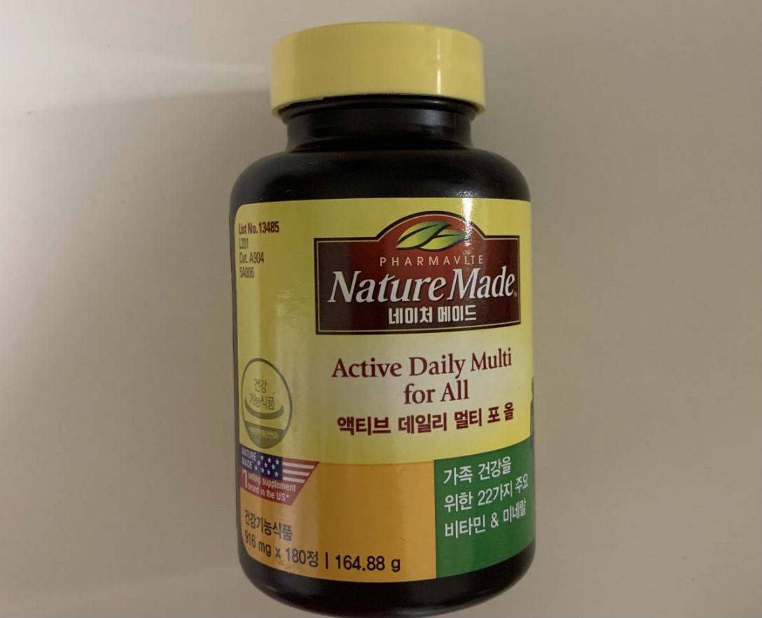 건강기능식품 종합비타민 네이처 메이드 엑티브 데일리를 먹고 있다.