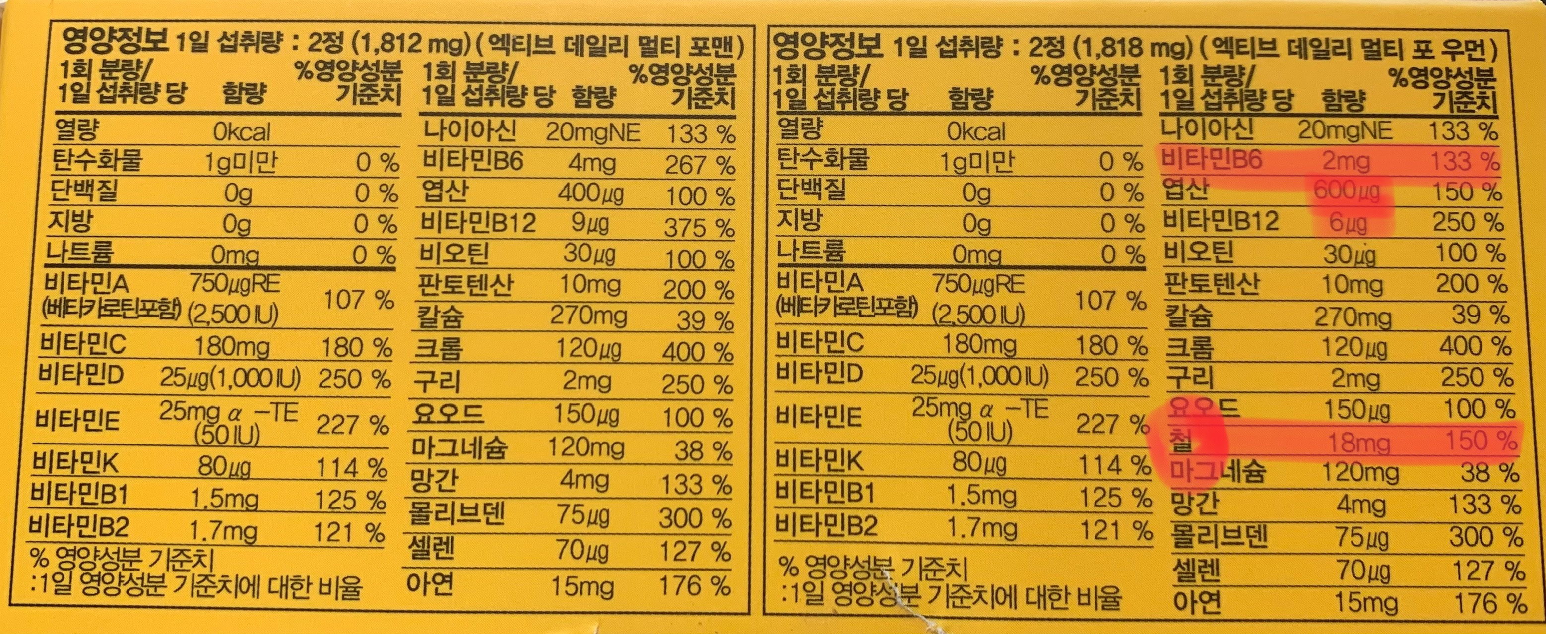 여성용에는 비타민B6가 덜 들어있고, 남성용에 없는 철이 1일 기준치의 150%나 들어있다는 점.