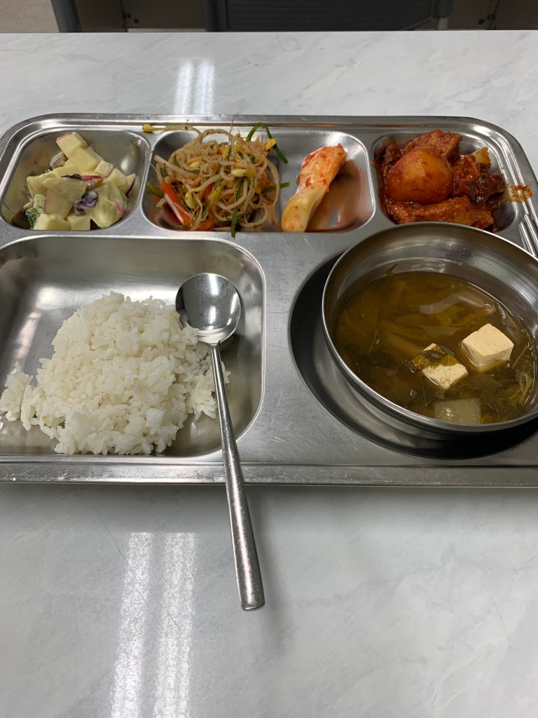 코로나 때문에 한 방향으로 홀로 앉아서 혼밥을 하기 때문에 새로 옮긴 직장에서 동료들과 ‘밥먹는 정’이 쌓이긴 어렵지만 감사한 마음으로 먹는 급식이다.
