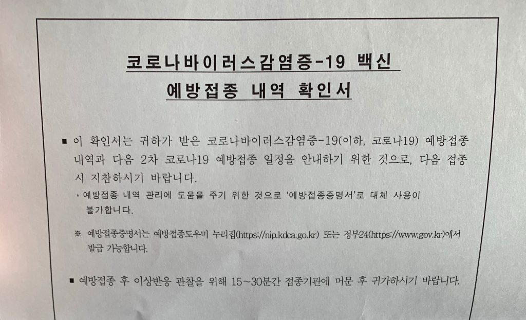 코로나19 백신 접종(화이자 1차)을 하고 왔다.