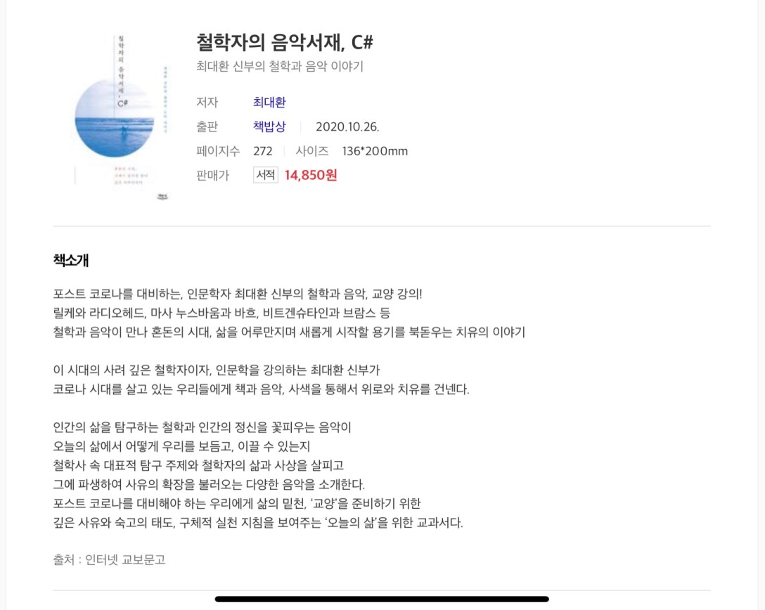 6월은 여러모로 참 바쁘게 보낸 달이다.한편으로는 출제자, 성적평가자로 다른 한편으로는 기말시험을 준비하는 어리바리 첫학기 학생으로 살았다. 그래도 독서모임 지정도서는 열심히 완독했고늦었지만 6월의 독서기록으로 남겨본다. 5명의 모임참여자들 중에 음악교육을 전공하신 분의 추천으로 읽게 됐다. 철학자의 음악서재 책검색 결과 이렇게 분명히 작게나마 ‘신부’의 철학과 음악 이야기라고 적혀있는데 그걸 너무 늦게 깨달았다. 그래서 ‘철학자’의 음악 서재, 그 중에서도… Continue reading ‘철학자의 음악서재 C#’을 읽었다.
