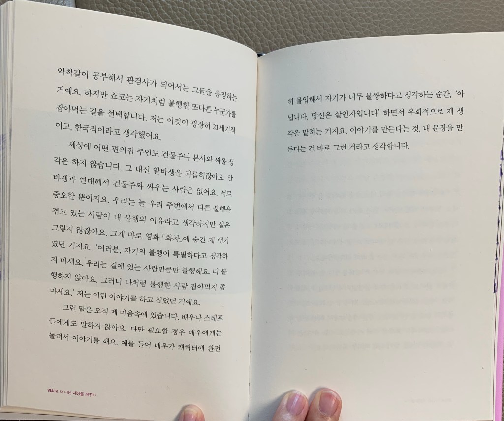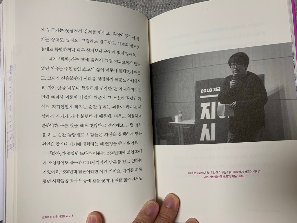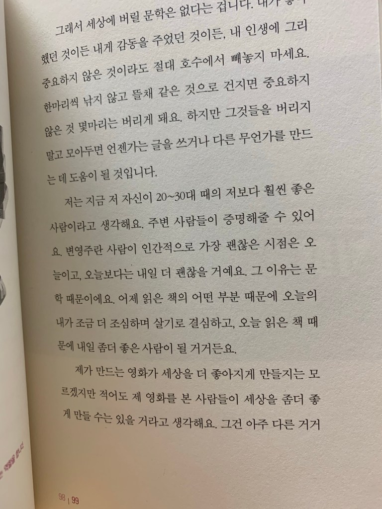 마음에 드는 멘트를 쏙쏙 골라서 해주는 ‘변영주’ 감독님의 강연이라 읽게 됐다.