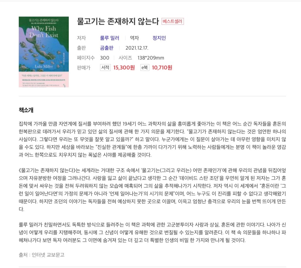 룰루 밀러의 책 ‘물고기는 존재하지 않는다’를 읽게 됐다.