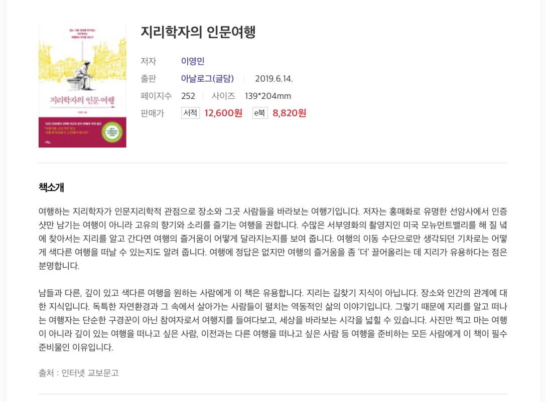 ‘지리학자의 인문여행’ 책검색 결과 이화여대의 인기 교양강의이고 MOOK에서도 들을 수 있다고 하는데책으로 만나보게 됐다. 아주 깊이가 있거나 어려운 내용도 아니고 편안하게 읽을 수 있는 책이었다. 특히 마음껏 여행을 떠나지 못하는 시기가 계속 되면서느꼈던 답답함들을 ‘여행의 의미’를 생각하고 정리하면서 어느 정도 해소할 수 있는 시간을 보낼 수 있다. 한 인간의 정체성은 태생적으로 결정되지 않는다. 삶의 여정을… Continue reading ‘지리학자의 인문여행’을 읽었다.