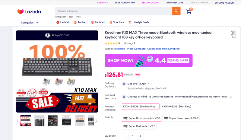 4.4 세일로 라자다에서 할인을 하고 있었기에 결정했다.