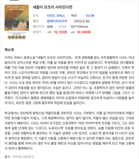 친구랑 둘이하는 북클럽.어딘가에서 추천을 받아 저장해두었었는데 같이 읽어보자는 의견에 냉큼 따랐다. 외국소설은 남이 추천해야 읽게되고아마 친구가 말을 꺼내지 않았다면 영영 몰랐을 작가였다. 원제는 'Bewilderment'인데 한글판 제목 때문에소설이 아니라 생태주의 문제의식을 다룬 비문학 책으로 생각했었다 처음엔. 처음에는 몰입하기가 좀 힘들었는데읽으면 읽을 수록 이제 나이가 들어서 그런가 로빈보다, 싱글 대디로 고군분투하는 시오에 감정이입을 하게 되면서 책장이 잘… Continue reading ‘새들이 모조리 사라진다면’을 읽었다.