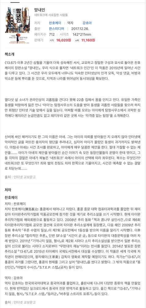 '13.67'을 읽고 너무 기대에 차올라서 연속적으로 읽었다. 이북리더기로 하는 독서는눈이 아프지 않고, 휴대성도 좋아서 아무리 두꺼운 책도 몰입해서 단기간에 확 읽어낼 수 있다는 것도 장점이다. 시작할 때 이북이기 때문에 두께를 확인 안하고 냅다 시작했는데어지간히 읽어도 끝이 안보였다.다 읽고 나서 책 말미에 실린 <작가의 말>을 읽어보니 '13.67' 보다도 더 긴 소설이었다. 그래서 사실 중간에 좀 힘들어지기도… Continue reading ‘망내인’을 읽었다.